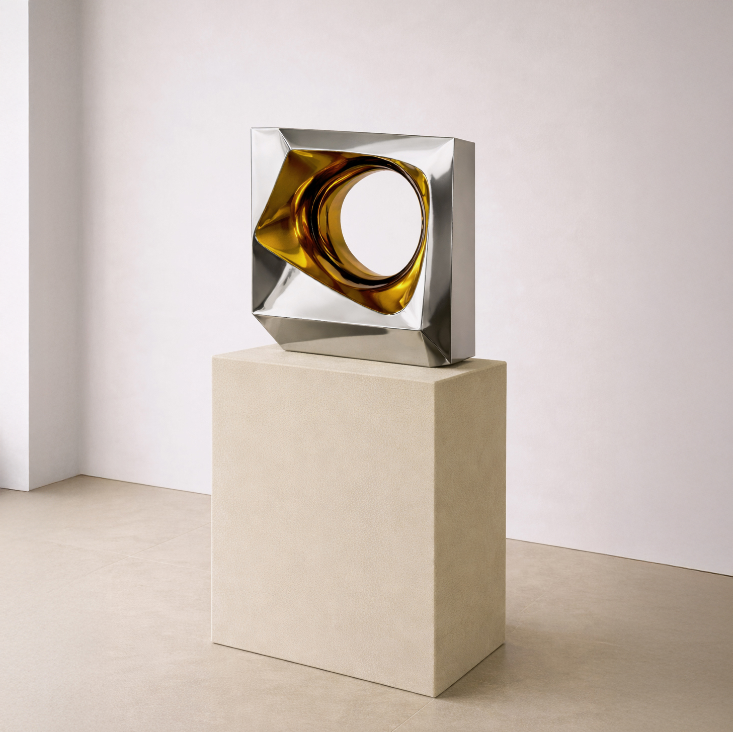 Shaped as spatial elements, one a vertical axis, the other a quiet lens. Reduced to their essentials: line, plane and reflection
