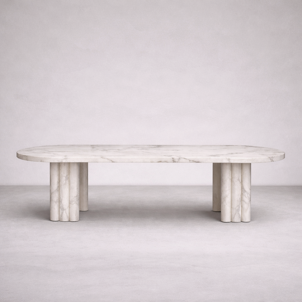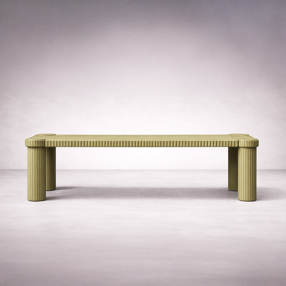 The repetition of lines wraps the legs and runs along the edge of the tabletop, creating a quiet architectural rhythm