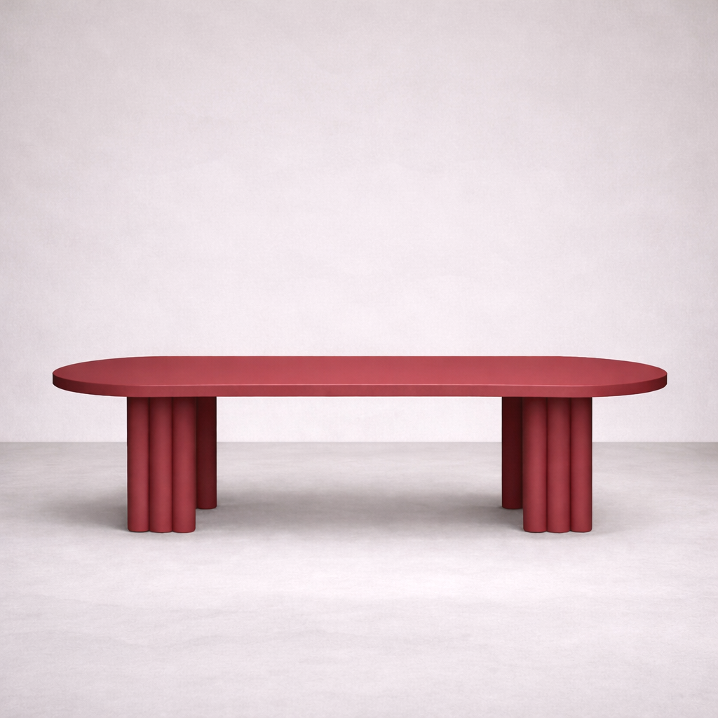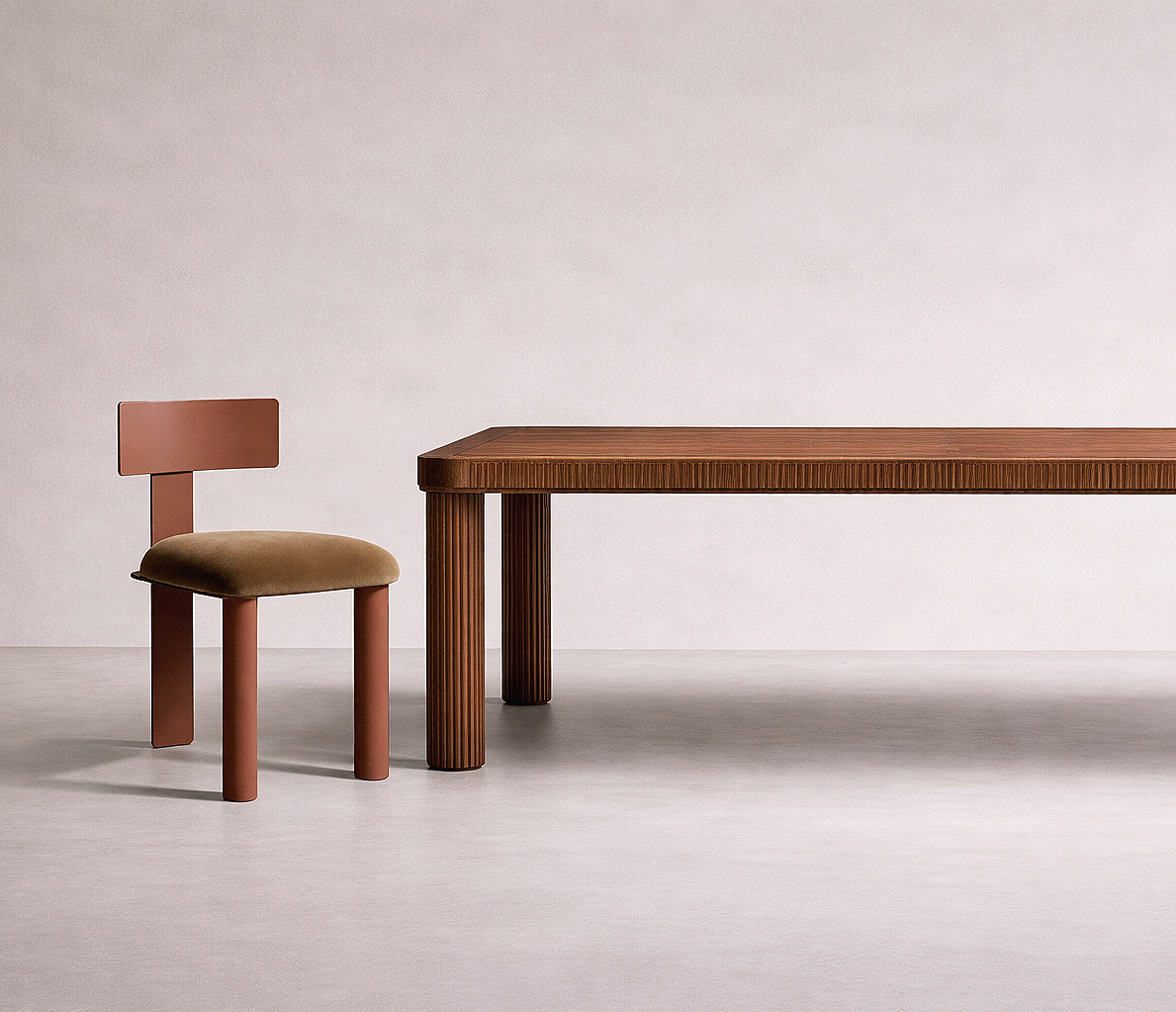 A long lacquered beam with ribbed edges. A monolithic piece shaped by industrial rhythm