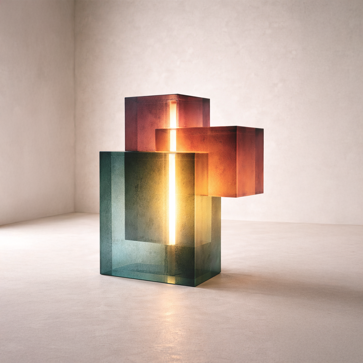 Lumen Column explores light as a contained architectural volume, where illumination moves through the glass, revealing, depth, colour and reflection.